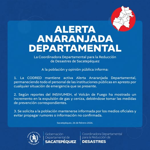 El Instituto Nacional de Sismología, Vulcanología, Meteorología e Hidrología (Insivumeh) emitió un boletín especial este jueves 26 de febrero de 2026, advirtiendo sobre la continuidad de una actividad eruptiva de alta intensidad en el Volcán de Fuego. Debido al incremento de las explosiones y el riesgo para las comunidades aledañas, la Gobernación Departamental de Sacatepéquez ha declarado Alerta Anaranjada.